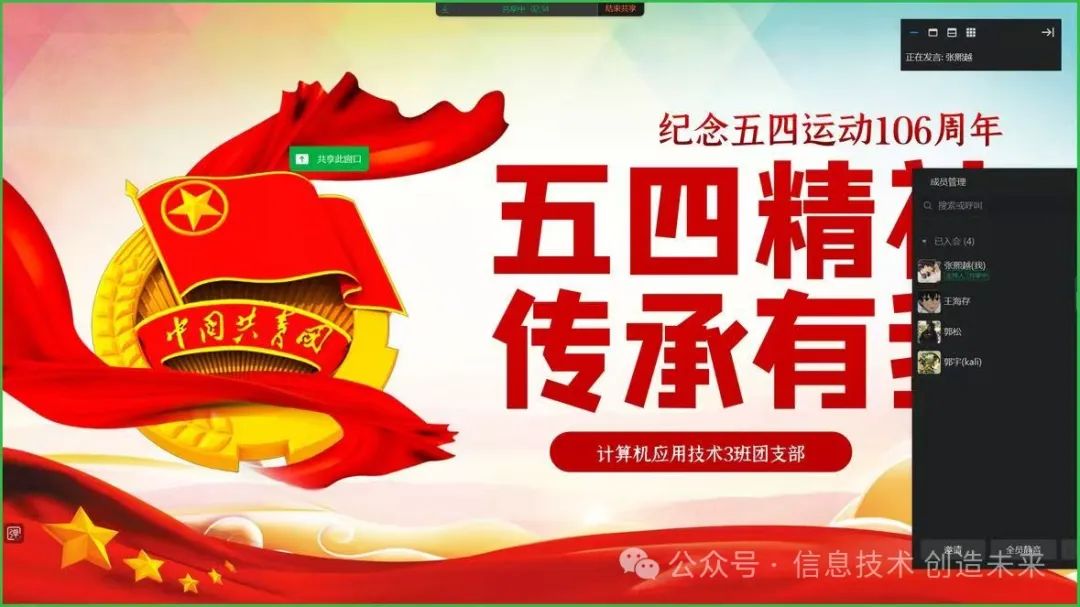 各班级团支书积极组织班级团员开展线上团课教育活动,以“弘扬五四精神,谱写青春华章”为主题,通过云端集结、隔屏共学的形式,引领青年团员重温五四运动光辉历程,深入学习习近平新时代中国特色社会主义思想,坚定理想信念。